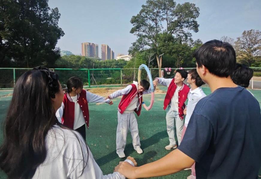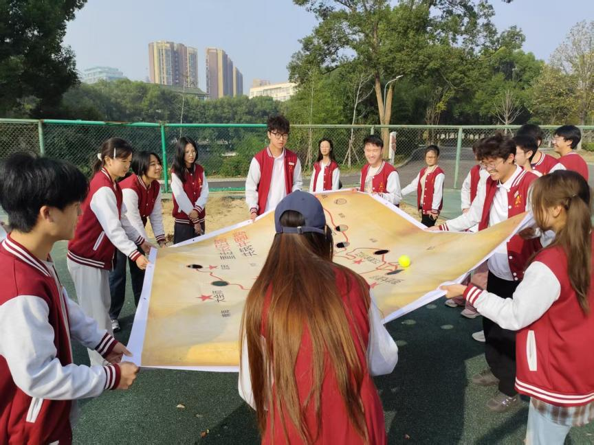 赛场上,学员们迅速组队、分工明确。“协力前行”中,大家步调一致、专注投入;“重走长征路”里,队员们默契传接、高效配合,生动诠释了“团结就是力量”的深刻内涵。场边助威声、欢呼声此起彼伏,热血澎湃的氛围彰显着青年学子的蓬勃朝气。