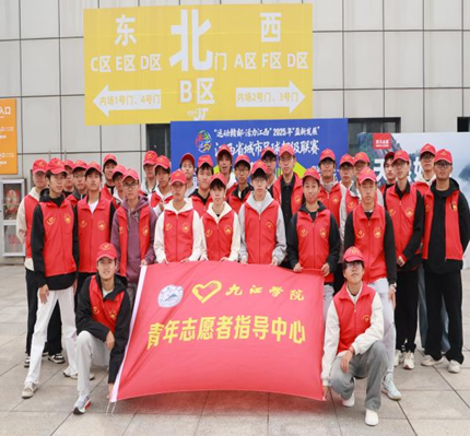 9 月 6 日至 10 月 26 日,“运动赣鄱・活力江西”2025 赣超联赛九江赛区赛事在九江市体育中心热力启幕。九江学院积极统筹青年志愿力量,组建 140 人专项志愿服务队全程驻场,以鲜艳的 “志愿红” 为这场跨越 40 余天的赛事筑牢保障,让 “奉献、友爱、互助、进步” 的志愿精神落地生根。