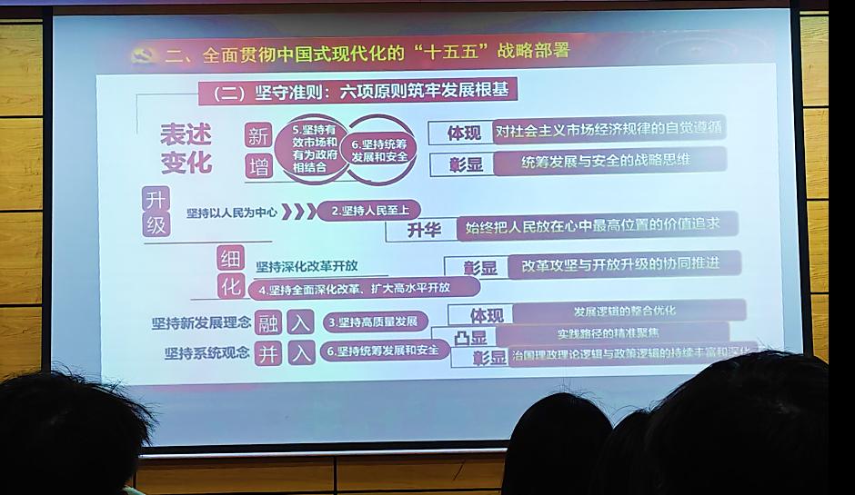 培训中,谢院长以“在接续奋斗中谱写中国式现代化新篇章”为主题,围绕习近平总书记在全会上的重要讲话和《中共中央关于制定国民经济和社会发展第十五个五年规划的建议》,系统阐述了全会的重大历史意义与实践价值。他紧扣“四个讲清楚”的核心要求,简明阐释了“十四五”时期重大成就、“十五五”时期关键定位与核心任务,深入分析了当前发展环境的优势与挑战,并解读了经济社会发展的指导方针与实践路径。结合青年学生特点,谢院长还分享了“理论+案例”“政策+故事”的宣讲技巧,指导成员将抽象理论转化为生动表达,强调要引导广大青年学子深刻领悟“两个确立”的决定性意义,增强“四个意识”、坚定“四个自信”、做到“两个维护”。